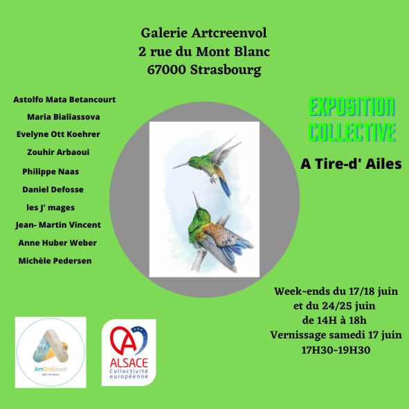- Exposition collective « A Tire d’ailes » à la Galerie Artcreenvol à Strasbourg de 14h à 18h tous les jours les week-ends des 17-18 juin et 24-25 juin 2023 (vernissage de 17h30 à 19h30 le samedi 17 juin 2023)