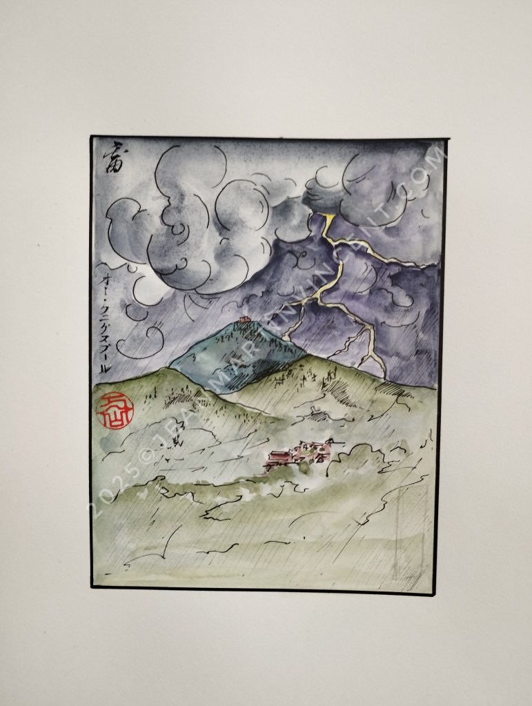 Le vent, omniprésent dans les paysages alsaciens, se matérialise dans cette aquarelle où le souffle d’air semble faire danser les éléments. L’image évoque la fluidité et le mouvement caractéristiques de l’art japonais. - 雷 (Orage) – Vue depuis la route entre Sélestat et Colmar