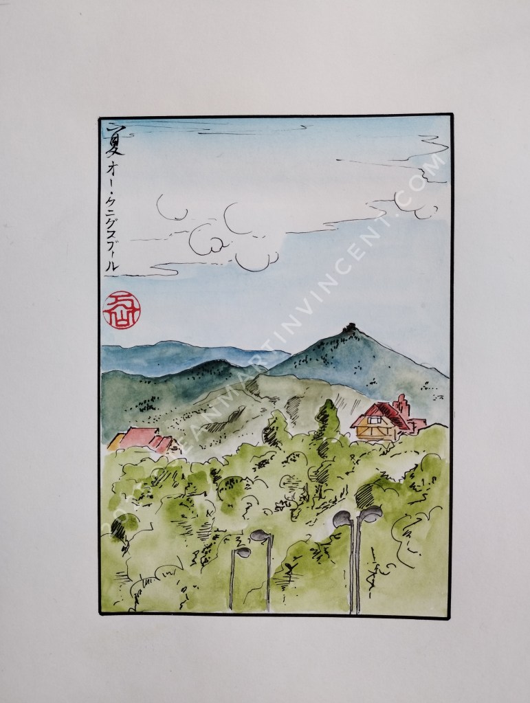 Ces aquarelles, réalisées à l’encre et à l’aquarelle sur papier, sont une fusion entre deux mondes : celui de l’Alsace et celui du Japon.