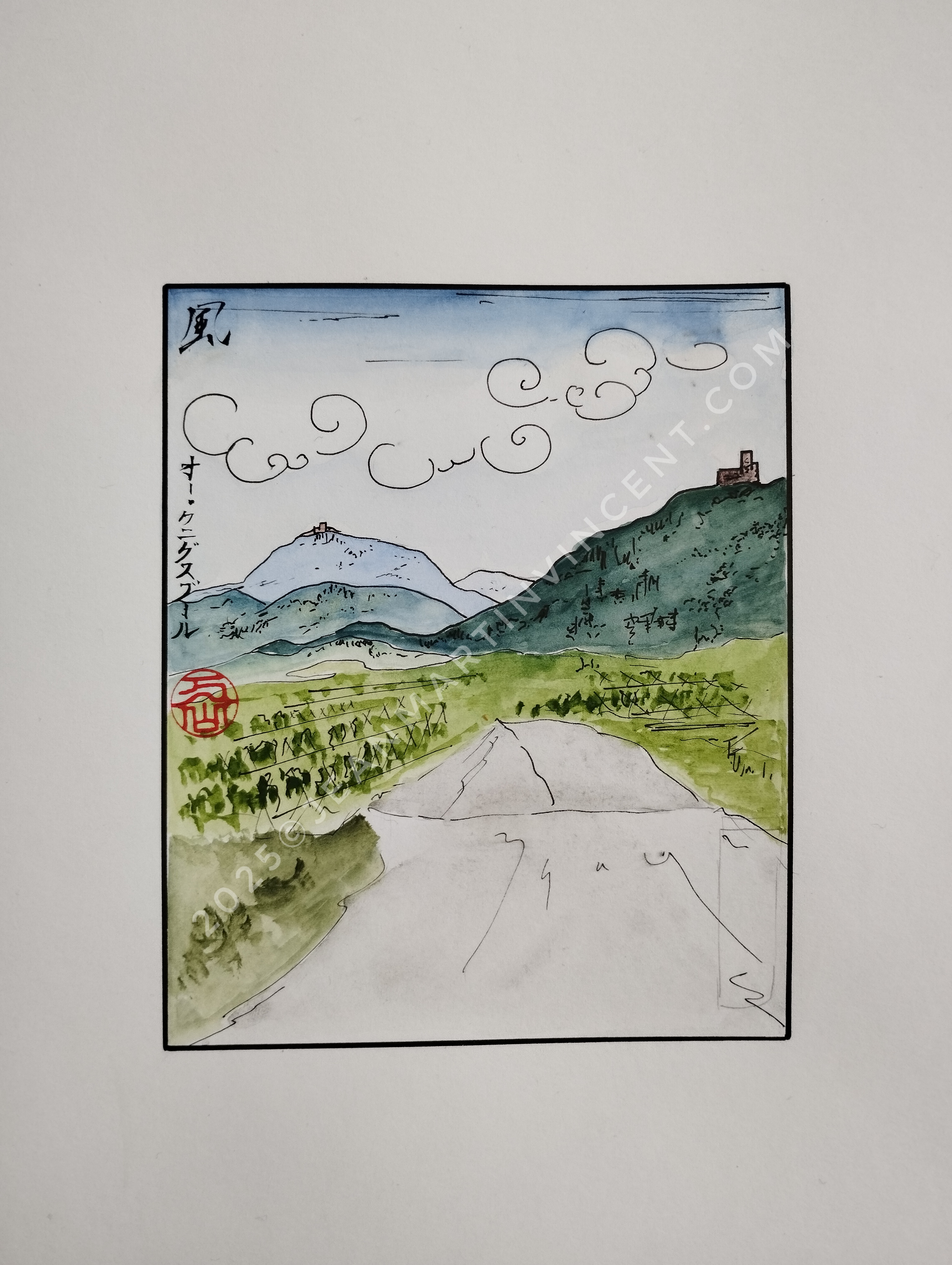 Je vous invite à découvrir cette série d’aquarelles, un mélange d’hommage à l’iconique Mont Fuji et à notre cher Haut-Koenigsbourg. Ces œuvres sont une exploration de l’art, de la culture et de la nature, où se mêlent influences nippones et alsaciennes. D’autres créations viendront compléter cette série, alors restez à l’écoute pour les prochaines !
