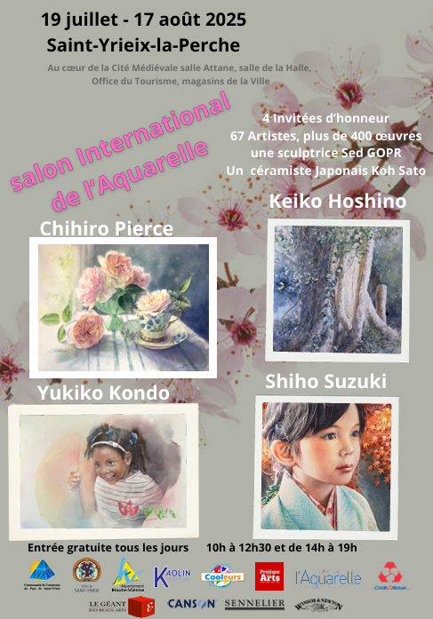 Le Salon International de l’Aquarelle fête sa 20ᵉ édition cet été à Saint-Yrieix-la-Perche. J’ai le plaisir d’y participer avec une exposition et plusieurs temps forts autour de la calligraphie japonaise.